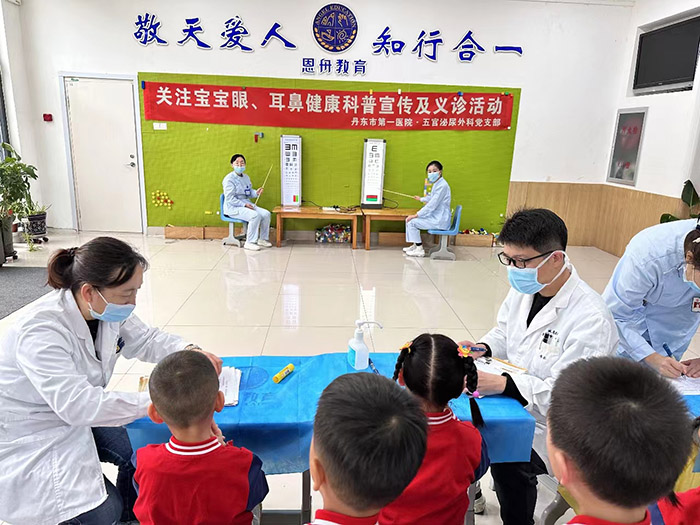 日前,我院五官泌尿外科党支部组织多名眼科、耳鼻喉科的医护专家,来到市恩舟幼儿园(八道园区),开展了关注宝宝眼耳鼻健康主题科普宣教义诊活动。此次活动主要针对幼儿园大班孩子,做了科普宣教,帮助孩子们增强爱眼护眼意识,养成良好的用眼习惯。同时,也进行了耳鼻疾病筛查,让家长能够早期发现并识别孩子们耳朵、鼻子、咽等部位的相关问题,指导孩子们正确擤鼻方式,减少中耳炎的发生。