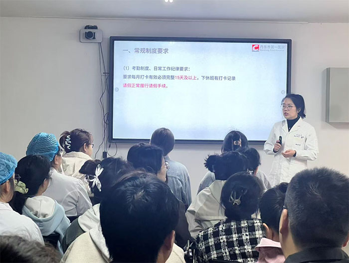 为进一步规范住院医师规范化培训管理,提升培训质量,助力学员顺利通过结业考核与执业医师考试,2025 年 10 月,丹东市第一医院隆重召开住院医师规范化培训专题会议。会议由住培办主任林松柳主讲,全体住培学员参会。