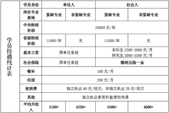 社会学员签订劳动合同,缴纳五险一金,除国家、省级补贴外,发放院级生活补助每月2500-3500元。