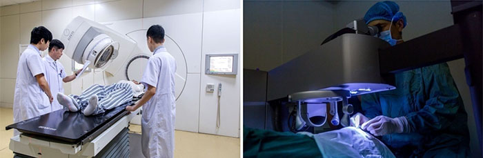 放射肿瘤科:肿瘤放疗科设有3个病区,共有床位133张。配有主任医师3人,副主任医师6人;硕士研究生15人。获批国家级药物及医疗器械临床试验基地,辽宁省肿瘤生物工程重点实验室。配有PET/CT,头体一体超级伽马刀、直线加速器、热疗机等肿瘤放疗科设备,在丹东地区率先开展了影像引导下三维适形放射治疗、影像引导下动态旋转调强放射治疗(IMRT)、立体定向放射治疗(X-刀、SBRT)、容积旋转调强放射治疗(VMAT)、头体伽玛刀治疗、妇科肿瘤三维后装放射治疗、深部热疗、生物细胞免疫治疗、基因检测等最新肿瘤治疗及检测技术,是丹东地区靶向治疗及生物免疫治疗的临床培训基地,丹东市肿瘤临床医学研究中心,丹东区域肿瘤治疗中心。