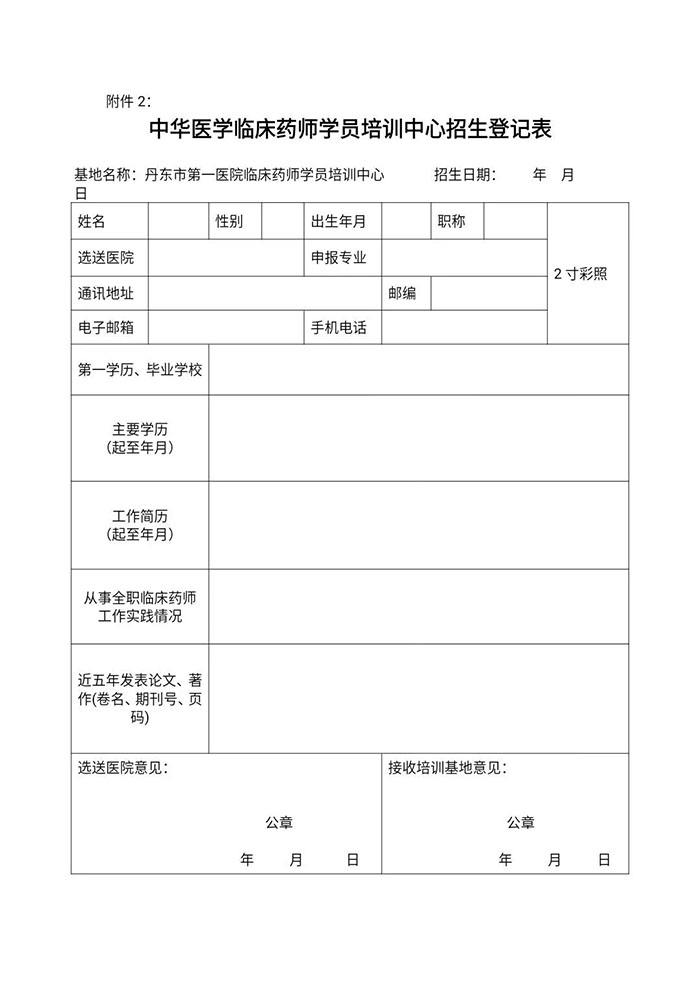 附件2《中华医学临床药师学员培训中心招生登记表》
