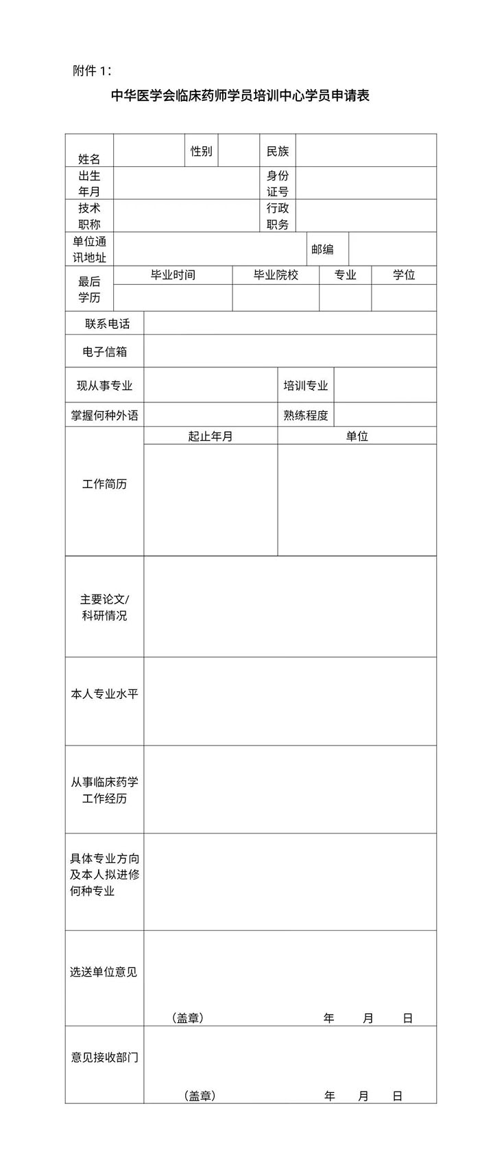 附件1《中华医学会临床药师学员培训中心学员申请表》